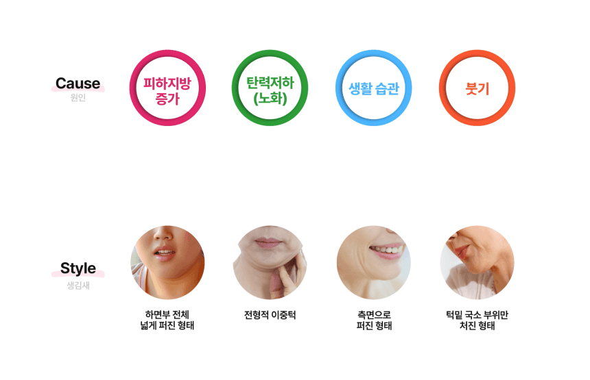 - Cause탄력 저하 + 턱 근육의 발달 + 피하지방층 증가